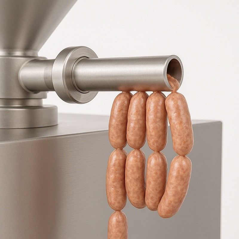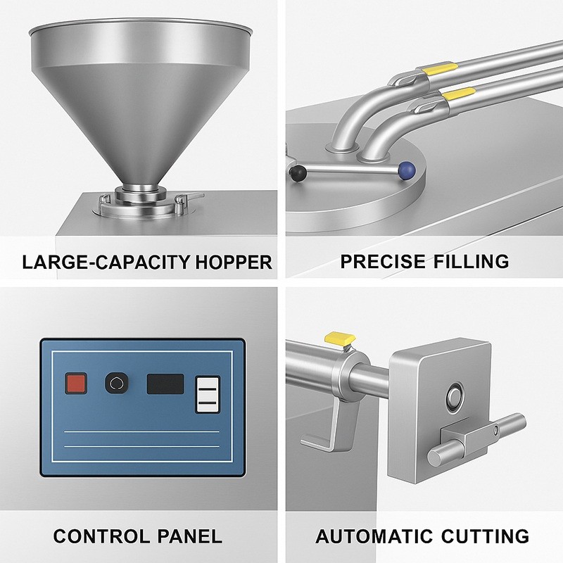 The Vertical Sausage Machine is a pneumatic, automated, and quantitatively controlled sausage tucking and twisting machine. It uses a pneumatically-driven cylinder to drive a piston in a reciprocating activity, upward and down within a metering cylinder to complete the filling procedure. Using computer-aided design, the machine boasts a compact structure, sensible style, and appealing appearance. All meat-contacting components and exterior parts are built of top quality stainless-steel. It is straightforward to run and clean, and flaunts accurate metering accuracy within ± 0.3 grams. It integrates automatic tucking and measurable filling, enabling totally automated manufacturing.